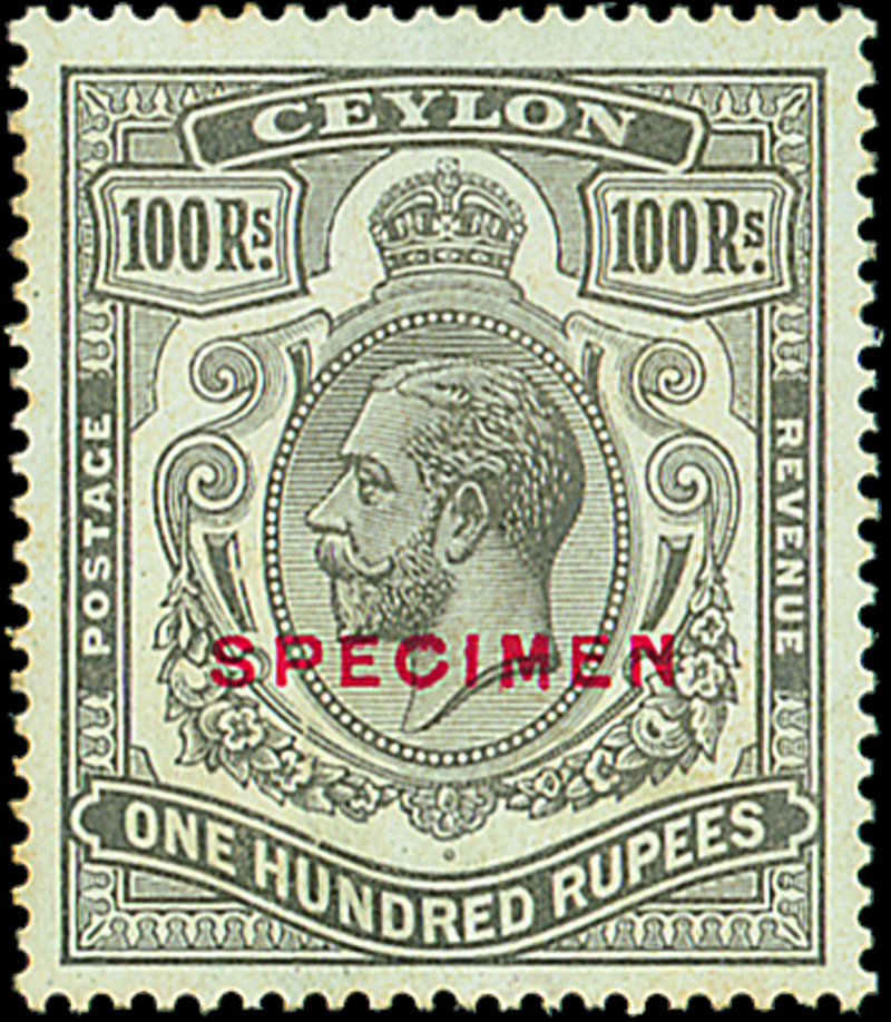 — 100r. brownish grey overprinted "specimen" (Type D16), large part original gum, a few minor gum tones otherwise fine. S.G. 359s, £425. Photo