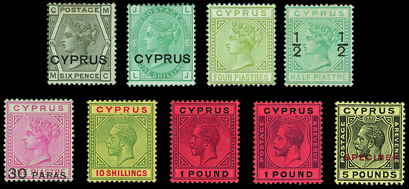 1880-1928 mint collection on leaves including 1880 ½d. Pl. 15, 1d. Pl. 220, 4d., 6d. and 1/-, 1881 (Feb.) ½d. on 1d. Pl. 174, 205 (2) and 216, 1881 (June) ½d. on 1d. Pl. 215 (3) and 218 (2), 1881 (June) 30pa. on 1d. Pl. 216, 1881 (July) CC Die I ½pi. to 6pi., 1882-86 CA Die I 12pi., 1882 CC "½" on ½pi. (light gum staining) and 30pa. on 1pi. (no gum), 1886 (Apr.) "½" on ½pi., 1894-96 ½pi. to 45pi., 1902-04 CA ½pi. to 45pi., 1904-10 MCA 5pa. to 45pi., 1912-15 MCA 10pa. to 45pi., 1921-23 Script 10pa. to 45pi. and MCA 10/- and £1, 1924-28 MCA £1 and Script ¼pi. to 90pi. and £5 overprinted "specimen", 1928 Anniversary ¾pi. to £1 and 1934 ¼pi. to 45pi. Condition generally fine with some unmounted. Photo