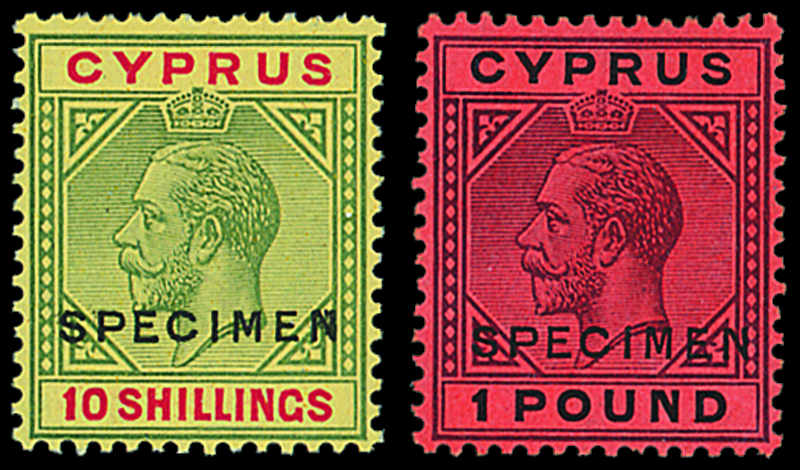 — MCA 10/- and £1, both overprinted "specimen" (Type D16), fresh and fine with large part original gum. S.G. 100s-101s, £600. Photo