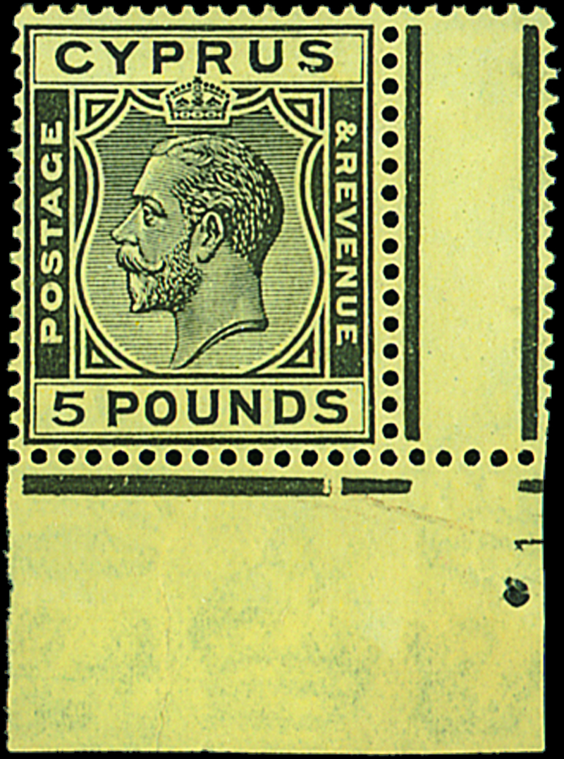 — Script £5 black on yellow, a lower right corner example with interpanneau margin at right, fine mint. B.P.A. Certificate (1998). S.G. 117a, £3500. Photo