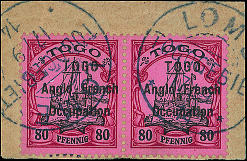 — 80pf. black and carmine on rose horizontal pair, neatly tied by Lome c.d.s. (17.9.14) on small piece, fine. S.G. H9, £550. Photo