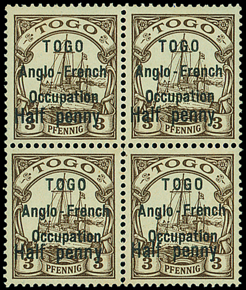 1914 (Oct.) wide setting, "Half penny" on 3pf. brown block of four, fine unmounted mint. S.G. H12, £640
