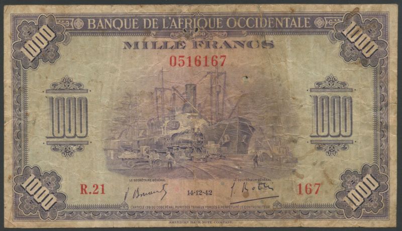 (x) Banque de l'Afrique Occidentale, French West Africa, 1000 francs, 14 December 1942, red serial number R.21-0516167, violet and pale green and pink, dockside scene at centre