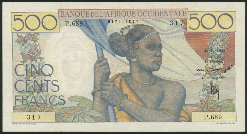 (x) Banque de L'Afrique Occidentale, 500 Francs (3) , 24 November 1948, 29 December 1950, 8 March 1951, multicoloured, woman with flag at centre, reverse three soldiers