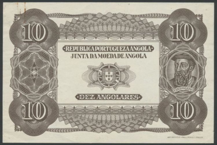 (x) Junta da Moneda de Angola, obverse and reverse uniface proofs for a 10 Angolares, ND, brown, Vasco da Gama at right, arms at centre, reverse, blue, two columns at centre, value in guilloches on either side
