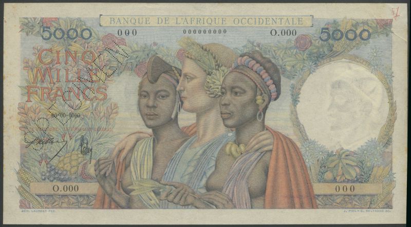 (x) Banque de L'Afrique Occidentale, specimen 5000 Francs, ND (1947-50), zero serials, multicoloured, France with two local woman at centre, reverse man and woman with musical instrument, perforated specimen