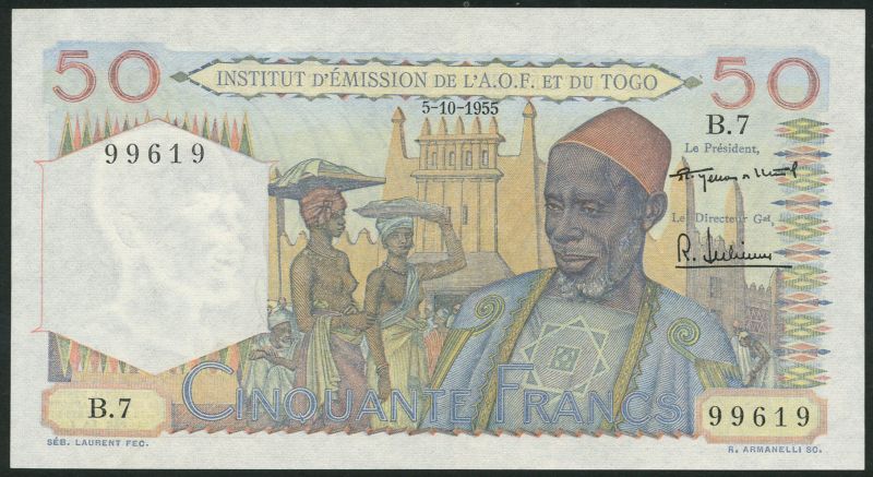 (x) Institut d'Emission de l'A.O.F et du Togo, 50 Francs, 5 October 1955, multicoloured, man wearing fez at right, two women at left, reverse man with bunch of bananas