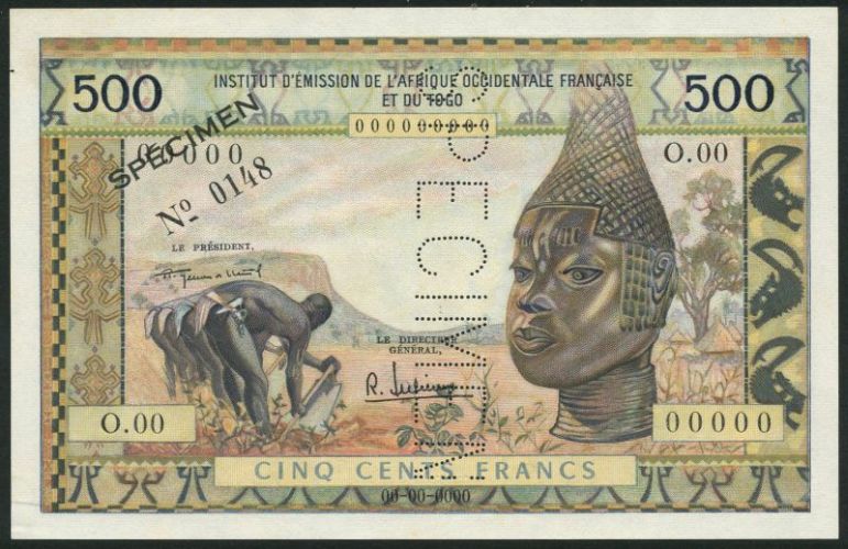(x) Institut d'Emission de l'A.O.F et du Togo, 500 Francs, ND (1956), signature 1, green and multicoloured, bronze figure at right, men at left, reverse woman at left, tractor at right, overprinted SPECIMEN No 0148 in black on obverse and perforated SPECIMEN