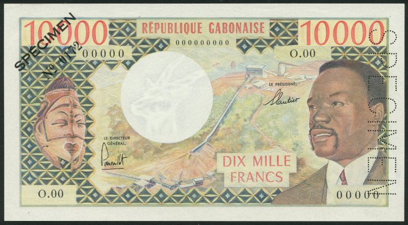 (x) Banque des Etats de l’Afrique Centrale, Republique Gabonaise, Banque Centrale, specimen 100,00 francs, ND (1971), zero serial numbers, green and multicoloured, President Bongo at right, tribal mask at left, mining scene at centre, reverse green and multicoloured, tractor at centre, tribal carvings at left and right