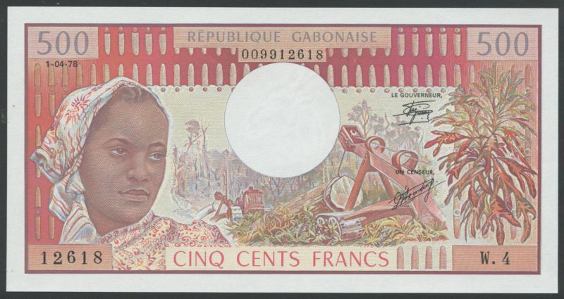 (x) Banque des Etats de l'Afrique Centrale, Republique Gabonaise, Banque Centrale, 500 Francs, 1 April 1978, signature 9, lilac-brown and multicoloured, woman at left, reverse students in laboratory; 1000 Francs, ND (1974-78), signature 4, blue and multicoloured, President Bongo at right, reverse carvings and transport; 5000 Francs, ND (1974-78), signature 9, brown and multicoloured, President Bongo at right, reverse carvings and mining