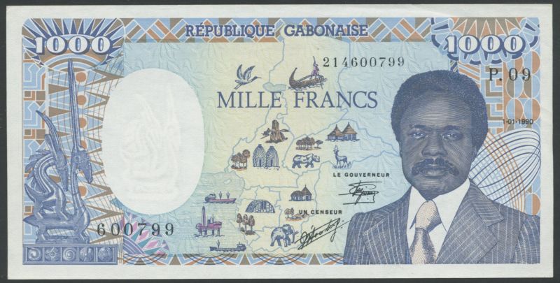 (x) Banque des Etats de l'Afrique Centrale, Republique Gabonaise, Banque Centrale, 5000 Francs, ND (1984), signature 9, brown, woman with fronds at right, reverse tractor; 10,000 Fmrancs, ND (1984), signature 9, green and brown, woman at right, reverse loading bananas; 500 Francs, 1 January 1985, brown, red and yellow, carving and jug, reverse man carving masks; 1000 Francs (2), 1 January 1985 with incomplete map, 1 January 1990 with complete map, blue, both President Bongo at right, reverse elephant and carving
