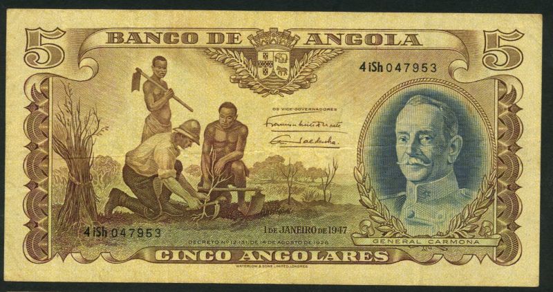 (x) Banco de Angola, 5 angolares (2), 1 January 1947, decree of 14 August 1926, pale and dark brown, General Carmona, the 11th President of Portugal (1926–1951), at right, arms top centre, reverse pale blue-green, also a 20 angolares, 1944, purple, Benevides at right. This note is quite unusual as although not a commemorative note, it does includes in its reverse design a commemorative features; the note marking the visit of President General Carmona in 1938 to the colony in the event of 455th anniversary for Vasco da Gama first landing in Luanda Bay; showing a marble column surmounted by the Portuguese arms, and part of his speech regarding the sacred unity of the colony with the motherland.