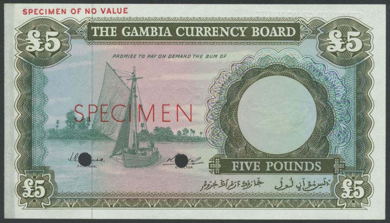 (x) The Gambia Currency Board, colour trial 10/-, blue, £1, orange brown, and £5, olive, all ND (1965), no serial numbers, sailing boat left centre, value at right and at each corner, reverse scenes of local harvest for the first note, loading sacks on quayside on the second, grinders on the third.