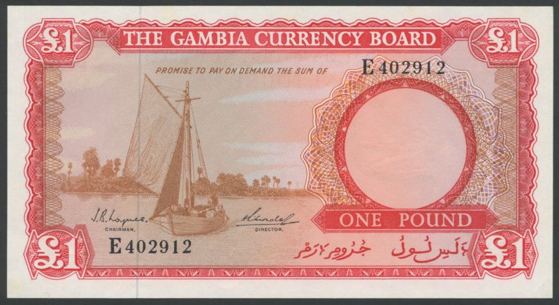 (x) The Gambia Currency Board, £1, ND (1965), serial number E 402912, red and multicoloured, sailing boat at left, value at right and at each corner, reverse red, loading sacks on quayside