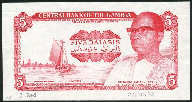 (x) Central Bank of the Gambia, 5 dalasis, red, a group of five uniface progressive proofs for the obverse ND (1972), President Dawda K. Jawara at right. Printed date on bottom '27.10.72’.