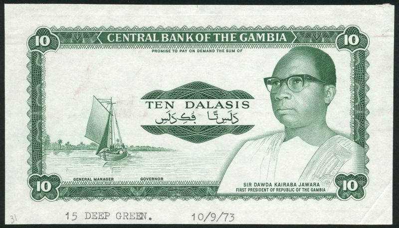 (x) Central Bank of the Gambia, 10 dalasis, green, a group of five uniface progressive proofs for the obverse ND (1972), President Dawda K. Jawara at right. Printed date on bottom '10.9.73’.