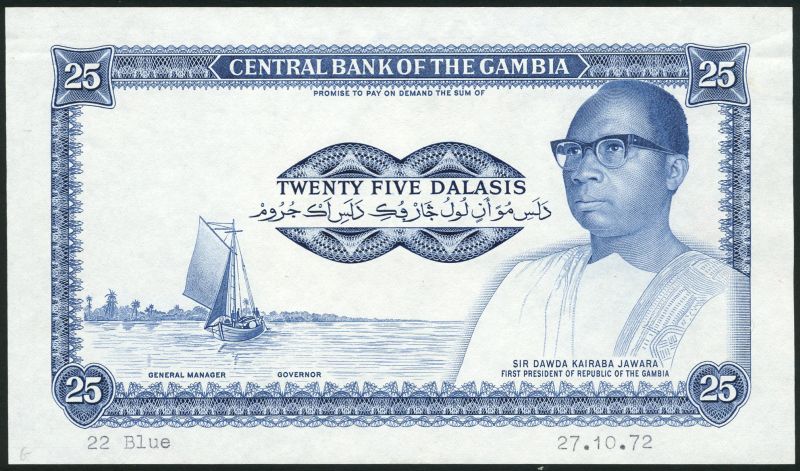 (x) Central Bank of the Gambia, 25 dalasis, blue, a group of five uniface progressive proofs for the obverse ND (1972), President Dawda K. Jawara at right. Printed date on bottom ‘27.10.72’.