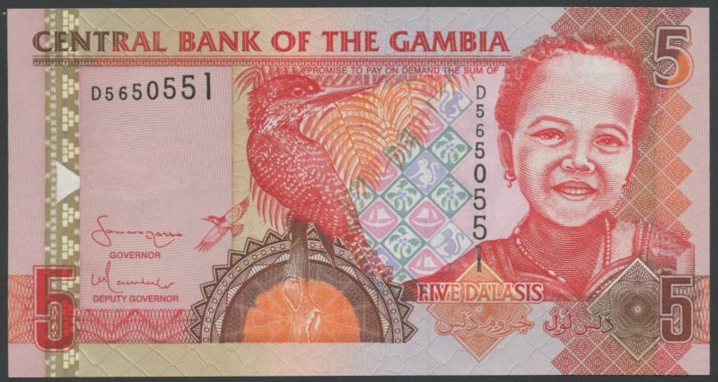 (x) Central Bank of Gambia, 5 dalasi, red, 10 dalasi, green, 25 dalasi, blue and 50 dalasi, violet, all ND (1991-1995), all signature 10, President Jawara at right, also 5,10,25 and 50 dalasi, ND (1996), all signature 12, local people at right