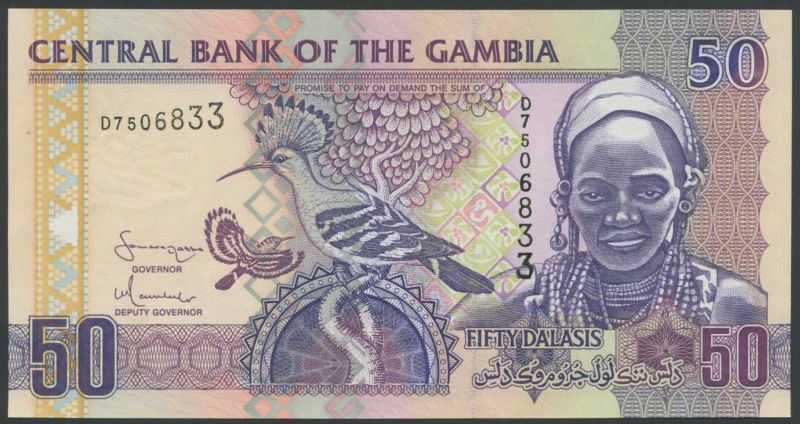 (x) Central Bank of Gambia, 5, 10, 25 (2), 50 and 100 dalasi, ND (2001), all local people and birds, also 5, 10, 25 50 and 100 dalasi (2), ND (2006), local people and birds farming, buildings, gates and satellite on reverse.