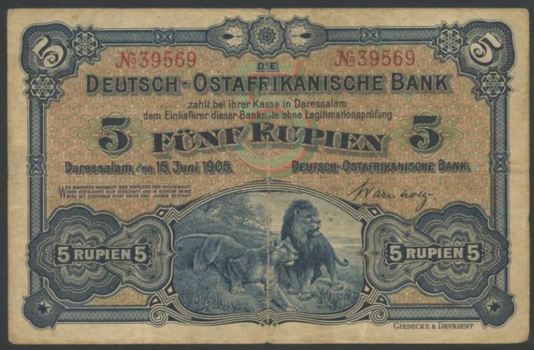 (x) Deutsch-Ostafrikanische Bank, 5 rupien, Daressalam, 15 June 1905, red serial number 39569, blue, pink and green, lion and lioness low centre, value at centre and at each corner, printed signature low right, reverse blue and brown, bank title and value