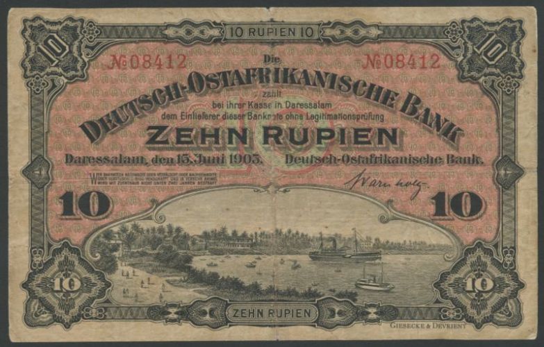 (x) Deutsch-Ostafrikanische Bank, 10 rupien, Daressalam, 15 June 1905, red serial number 08412, black, pink and green, the port of Daressalam low centre, value at centre and at each corner, printed signature low right, reverse lilac and green, bank title and value