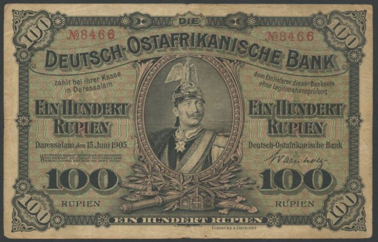 (x) Deutsch-Ostafrikanische Bank, 100 rupien, Daressalam, 15 June 1905, red serial number 8466, black, pale lilac and green, Kaiser Wilhelm II at centre, value low left and right and at each corner, reverse pale lilac and green, bank title and value