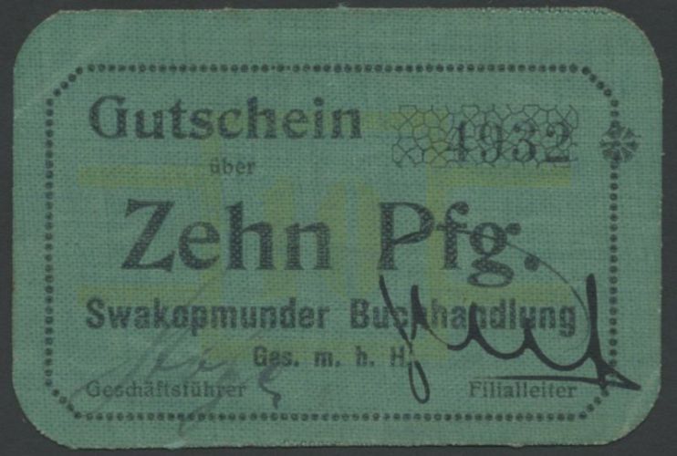 (x) German Southwest Africa, 10 pfennig, ND (1916-1918), serial number 4932, black text on green linen, two manuscript signatures below