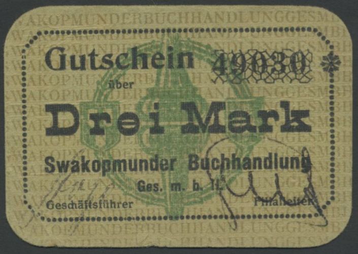 (x) German Southwest Africa, 3 mark, ND (1916-1918), serial number 4932, black text on green card, two manuscript signatures below