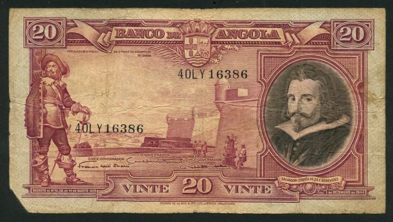(x) Banco de Angola, 5 escudos (2), 1947, pale and dark brown, General Carmona at right, arms top centre, reverse pale blue-green, also a 20 escudos, 1944, purple, Benevides at right