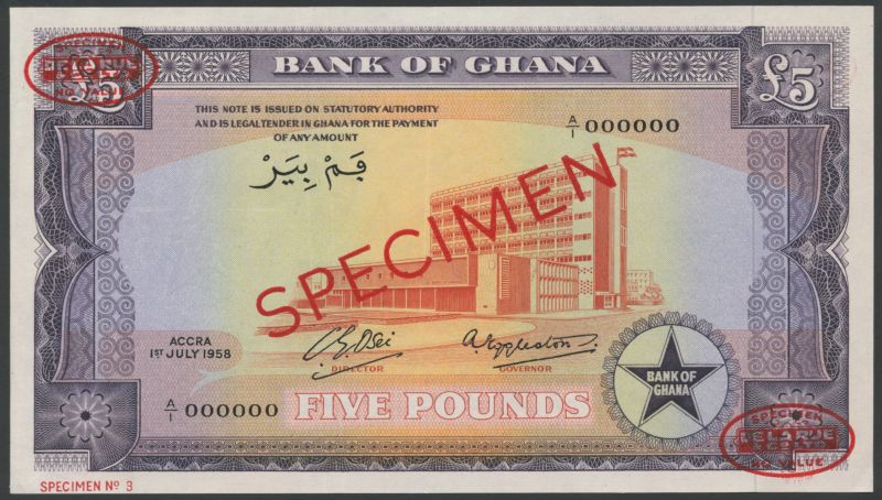 (x) Bank of Ghana, a small group comprising, 10 Shillings, 1 July 1963,No. Z/1 762650, green, brown and multicoloured, bank building at right, reverse star with the name Bank of Ghana; £1 (2), 1 July 1962, No. S/5-614031 & S/5-614556, both red, blue and multicoloured, bank building at centre, reverse cocoa pods on a nice full panorama image ; £5, 1 July 1962, No. A/1-858012, and specimen £5, Accra 1 July 1958,No.A/1-000000, overprinted SPECIMEN and with De La Rue ovals in red on obverse and reverse, both purple, red and multicoloured, bank building at centre, reverse cargo ships and logs.