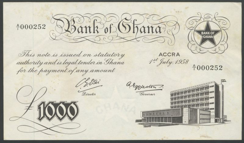 (x) Bank of Ghana, £1000, 1 July 1958, serial number A/1 000252, black on white, bank building at lower right, value at lower left reverse value and stylised pattern