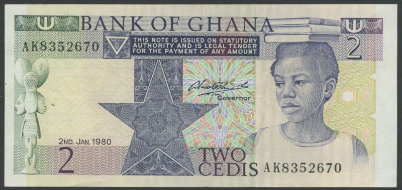 (x) Bank of Ghana, a group comprising, 1 Cedi, 7 February 1979, green and multicoloured, boy at right, reverse man weaving; 2 Cedis, 2 January 1980, blue-black and multicoloured, schoolgirl at right, reverse crop tending; 5 Cedis, red and multicoloured, old man at right, reverse logging; 10 Cedis (2), 2 January 1980, 2 July 1980; specimen 10 Cedis (3), 6 March 1982, serial prefixes BJ, BN, BQ, overprinted SPECIMEN in red with two De La Rue Specimen ovals on obverse and reverse, one punch hole, all purple and multicoloured, woman at right, reverse fishermen