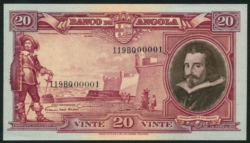 (x) Banco de Angola, 20 escudos, 1 March 1951, serial number 119BQ 00001, purple and pale orange, Salvador Correia De Sa E Benevides at left and right, fortress at centre, arms top centre, reverse purple, painting 'The reconquest of Luanda 1648' at centre