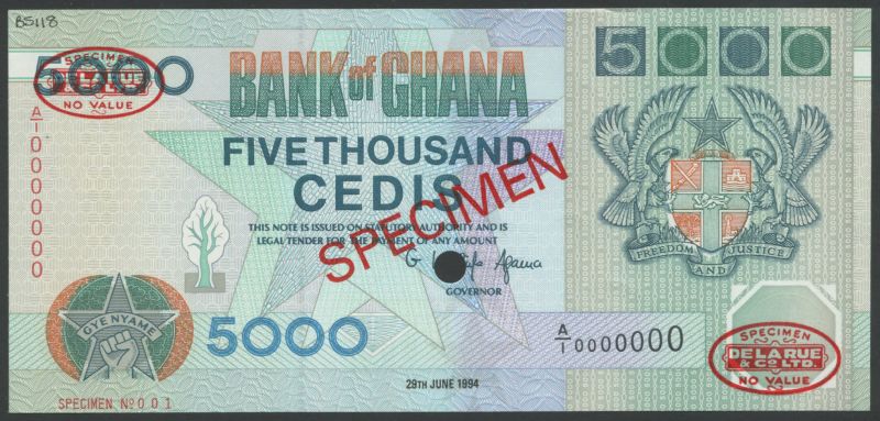 (x) Bank of Ghana, a group comprising, Specimen 5000 Cedis(4), 29 June 1994, prefix A/1, 8 January 1995, prefix C/1, 23. 2. 1996, prefixes E/1, J/1, green and orange, arms at right, reverse freighter and logs, all overprinted SPECIMEN in red with two De La Rue Specimen ovals Red seal on obverse and reverse, one punch hole at lower centre