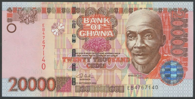(x) Bank of Ghana, a group comprising, 1000 Cedis (3), 6 January 1995, No 11/A05586755, 1 July 1999,No. AN2339162, 2 September 2002, No. MF 9137708,green and multicoloured, diamonds at right Arms at lower left, reverse harvesting cacao; 2000 Cedis (2), 8 January 1995,No. C/1 6895926 and 5 December 1996,No. AA 0013913, red-brown, green and multicoloured, bridge at right, Arms at lower left, reverse fishing; 5000 Cedis (3), 23 February 1996,No. G/1 0680698, 2 May 1998, No. AM 4906808, 4 August 2006,No. EC 1140188, green and multicoloured, arms at upper right, reverse ship and logs;10,000 Cedis, 2 September 2002,No. DC 4898986, purple and multicoloured, Kwame Nkrumah and other five leaders at right (Ebenezer Ako Adjei, Edward Akufo-Addo, Joseph Boaky Danquah, Emmanuel Odarkwei Obetsebi-Lamtey and William Ofori Atta), reverse Independence Arch; and 20,000 Cedis, 2 September 2002,No. EB 4767140, red and multicoloured,The Ghanaian composer, musicologist and teacher Ephraim Amu at right, reverse theatre.