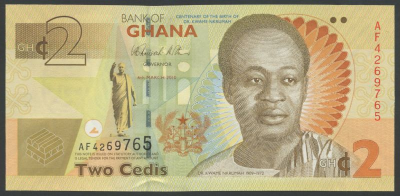 (x) Bank of Ghana, a group of the 2007-10 Issues all with Kwame Nkrumah and five other leaders at right (Ebenezer Ako Adjei, Edward Akufo-Addo, Joseph Boaky Danquah, Emmanuel Odarkwei Obetsebi-Lamtey and William Ofori Atta) on obverse comprising 1 Cedi(2),No. AX 323737 & No. BN 7893059, red, reverse dam; 5 Cedis,blue, reverse buildings; 10 Cedis, green, reverse bank building; 20 Cedis, violet, reverse government building; 50 Cedis, brown, reverse buildings, and 2 Cedis, Commemorative issue (Century Of Birth Of Nkruma) 2010,No. AF 4269765, yellow Dr. Kwame Nkrumah on the right, reverse parliament buildings