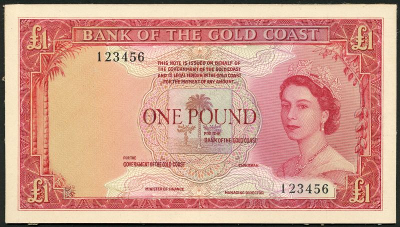 (x) Bank of the Gold Coast, for a 1, ND (30 April 1953), serial number 123456, red and multicoloured, Elizabeth II at right, palm trees at centre, reverse red, harvesting