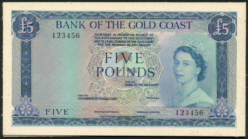(x) Bank of the Gold Coast, an obverse and reverse composite essay for a £5, ND (1953), serial number 123456, blue and multicoloured, Elizabeth II at right, palm tree at centre, value at centre and top left and right, reverse blue and white, mining scene, value at left and right