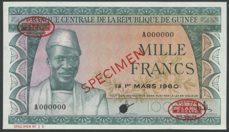 (x) Banque Centrale de la Republique du Guinee, a group of specimens of the 1 March 1960 Issue, all with President Sekou Toure at left, comprising 50 Francs, brown, reverse mine; 100 Francs, dark brown, reverse pineapple harvesting; 500 Francs, blue, men hauling boats; 1000 Francs green, banana harvesting, all overprinted SPECIMEN in red with two De La Rue Specimen ovals on obverse and reverse