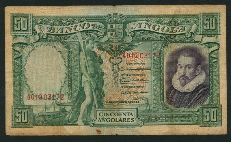 (x) Banco De Angola, 50 angolares, 1 October 1944, red serial number 40IQ 03172, green and multicoloured, Manuel Cerveira Pereira at right, fisherman at centre, arms top centre, value at centre and at each corner, reverse green, the founding of Benguela in 1617
