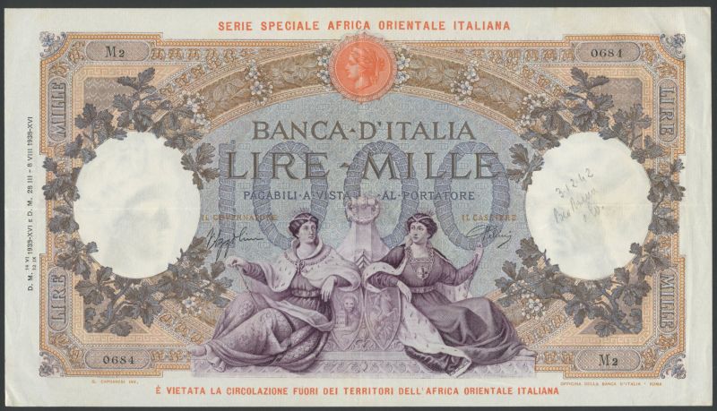 (x) Banca d'Italia, 1000 Francs, 1938, serial number M2-0684, violet, brown and blue, Venezia and Genoa at lower centre, wreaths at right and left, SERIE SPECIALE AFRICA ORIENTALE ITALIANA in red in top margin, reverse statue of Agriculture, Ceres and Mercury at centre value at each corner ITALIANA in red at top