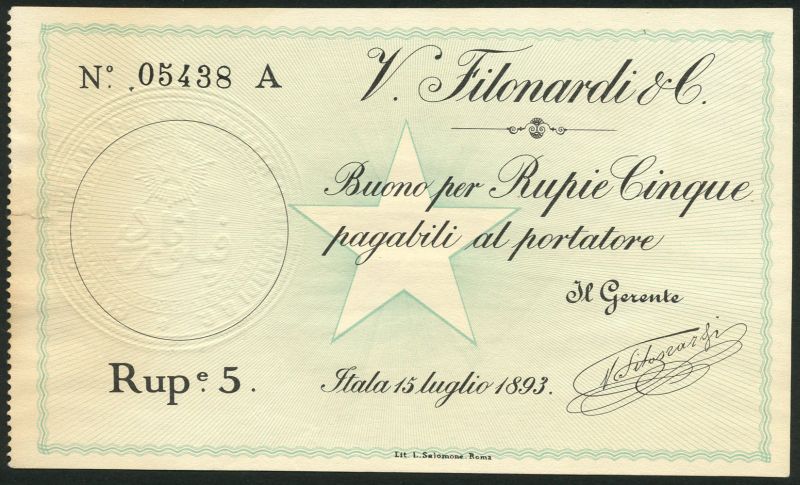 (x) Italian Somaliland, V. Filonardi & Co., 5 rupie, 15 July 1893, serial number 05438 A, black text on pale blue and white, star art centre, embossed seal at left, printed signature low right, reverse red Arabic text