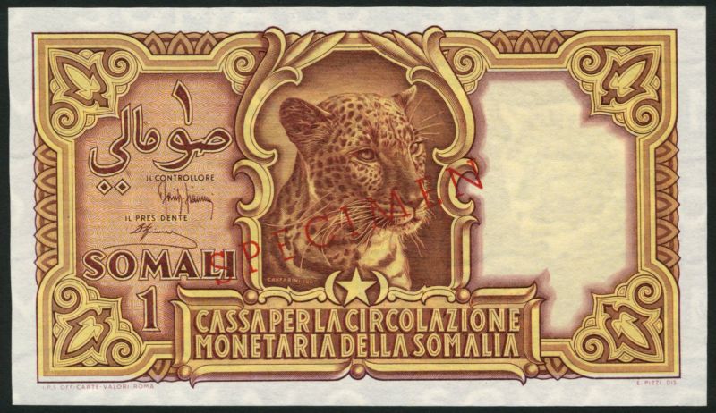 (x) Cassa per la Circolazione Monetaria della Somalia, specimen 1 somali, 1950, red-brown and yellow, leopard's head at centre, value at left, reverse brown-violet, value at centre, ROMA 1950 at right