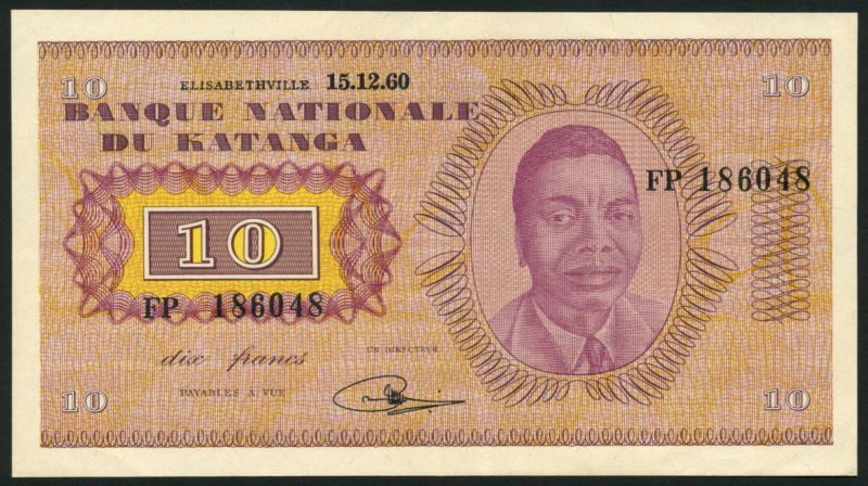 (x) Banque Nationale du Katanga, 10 francs, Elisabethville, 15 December 1960, serial number FP 186048, purple, yellow and lilac, Moise Tshombe at right, reverse bank building at left, value at right