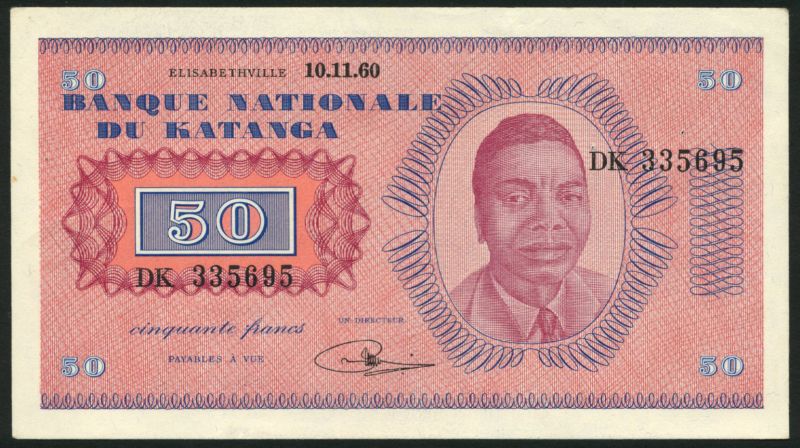 (x) Banque Nationale du Katanga, 50 francs, Elisabethville, 10 November 1960, serial number DK 335695, pink and blue, Moise Tshombe at right, reverse bank building at left, value at right