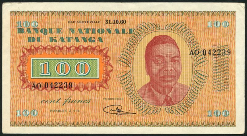 (x) Banque Nationale du Katanga, 100 francs, Elisabethville, 31 October 1960, serial number AO 042239, pale orange, green, Moise Tshombe at right, reverse bank building at left, value at right