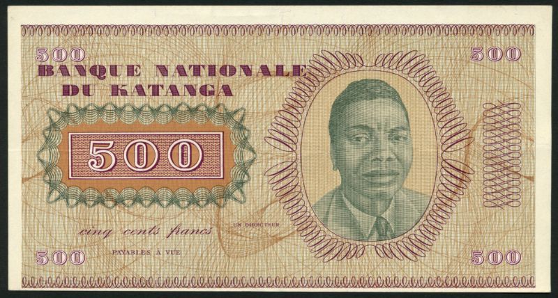 (x) Banque Nationale du Katanga, 500 francs remainder, Elisabethville, 31 October 1960, no serial numbers, green, brown and lilac, Moise Tsombe at right, reverse bank building and value omitted