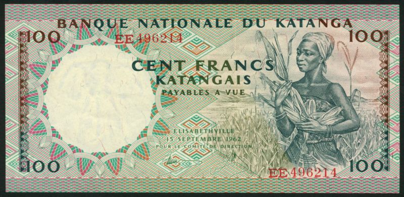 (x) Banque Nationale du Katanga, 100 francs, Elisabethville, 15 September 1962, red serial number EE 496214, green and multicoloured, woman with maize at right, value at centre and at each corner, reverse green, circular pattern at left