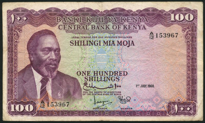 (x) Central Bank of Kenya, 100 shillings (2), 1966, 1968, prefixes A/5, A/12, purple and multicoloured, President Jomo Kenyatta at left, value at centre and at each corner