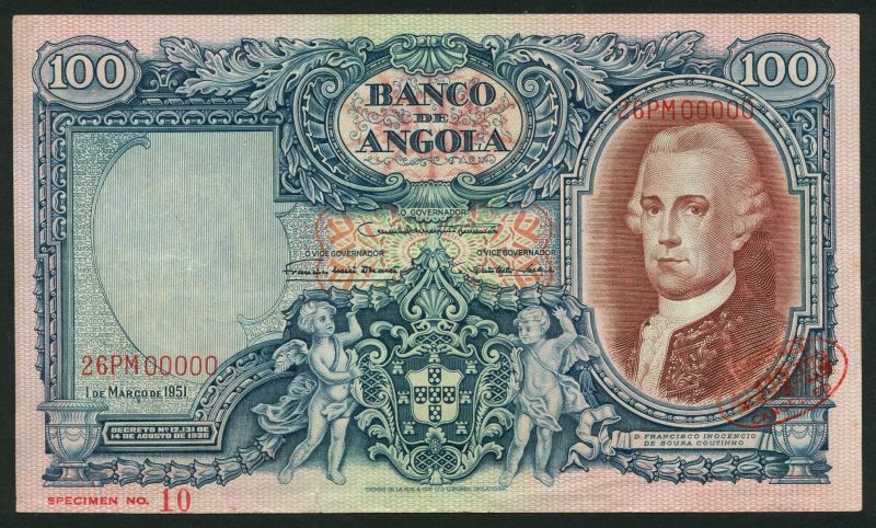 (x) Banco de Angola, specimen, 100 angolares, 1 March 1951, red serial number 26PM00000, blue and multicoloured, Sousa Coutinho in brown panel at right, arms and cherubs low centre, reverse purple, European explorers, natives, arms low right, value at each corner